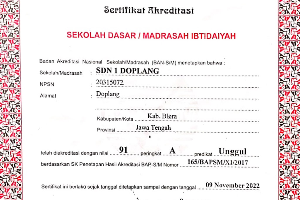 SDN 1 Doplang ditetapkan oleh Badan Akreditasi Nasional Sekolah/ Madrasah (BAN-S/M) sebagai sekolah berakreditasi nilai 91 peringkat A Predikat UNGGUL. Keputusan tersebut disampaikan berdasarkan SK Penetapan Hasil Akreditasi BAP-S/M Nomor 165/BAPSM/XI/2017. Penetapan tersebut berlaku sejak tanggal penetapan 09 November 2017 sampai dengan 09 November 2022.