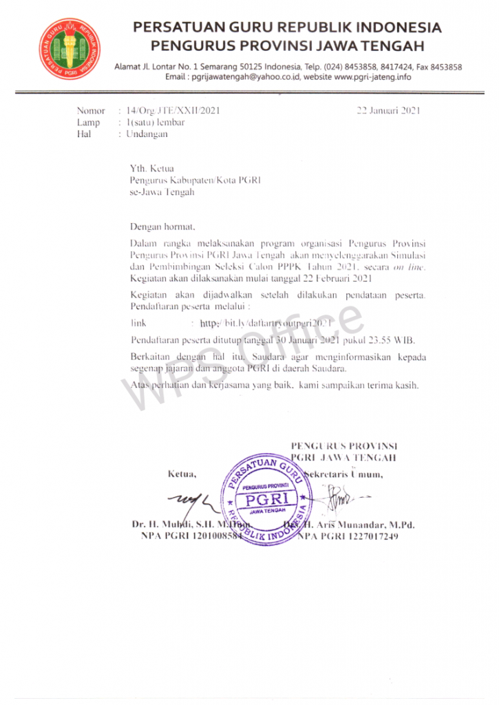 Pendaftaran peserta simulasi dan bimbingan seleksi PPPK dilakukan secara online melalui link: http://bit.ly/daftartryoutpgri2021 ,
