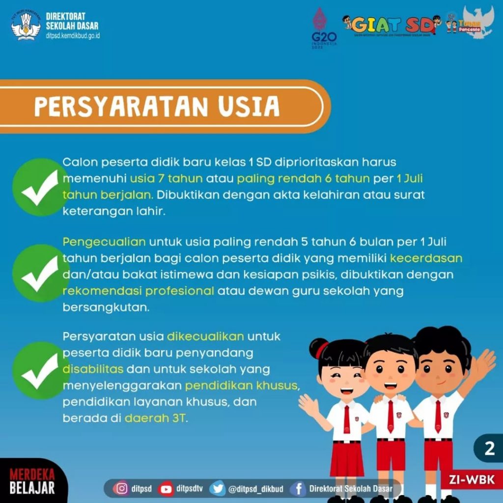 - Calon peserta didik baru kelas 1 SD diprioritaskan harus memenuhi usia 7 tahun atau paling rendah 6 tahun per 1 Juli tahun berjalan. Dibuktikan dengan akta kelahiran atau surat keterangan lahir.